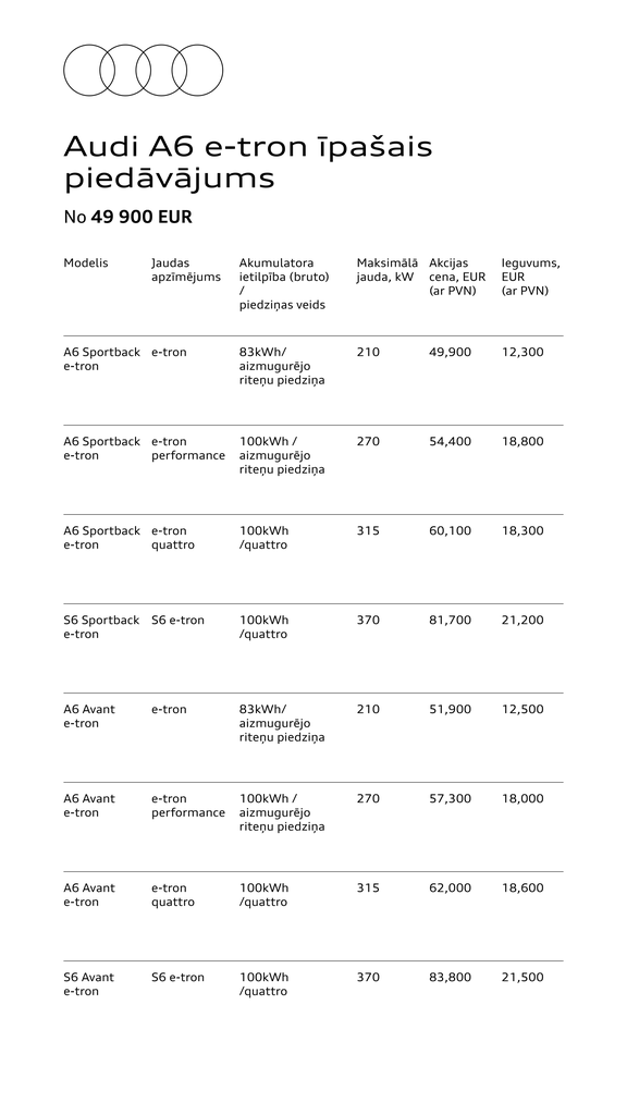 Tagad Audi A6 Sportback e-tron ar akumulatoru ietilpību 83kWh un 210 kW jaudu pieejams par 49 900 EUR. Piedāvājums pieejams arī citiem A6 Sportback e-tron, A6 Avant e-tron, S6 Sportback e-tron un S6 Avant e-tron modeļiem. (Cenrādis apskatāms zemāk).
