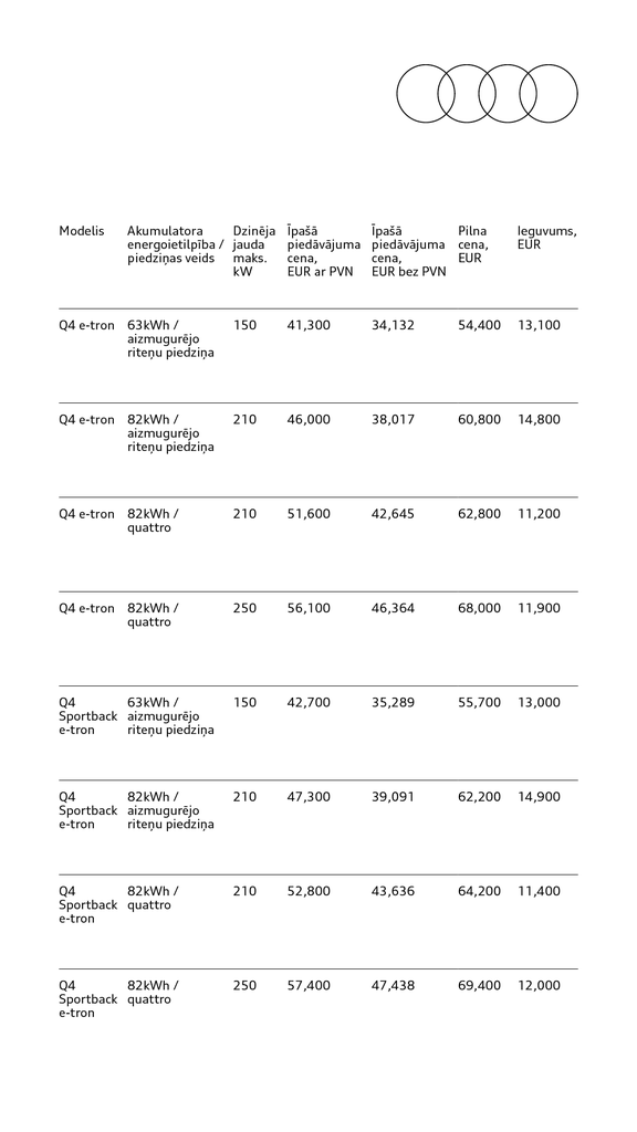 Tagad Audi Q4 e-tron ar akumulatoru ietilpību 63 kWh un 150 kW jaudu pieejams par 41 300 EUR. Piedāvājums pieejams arī citiem Q4 e-tron un Q4 Sportback e-tron modeļiem. (Cenrādis apskatāms zemāk).